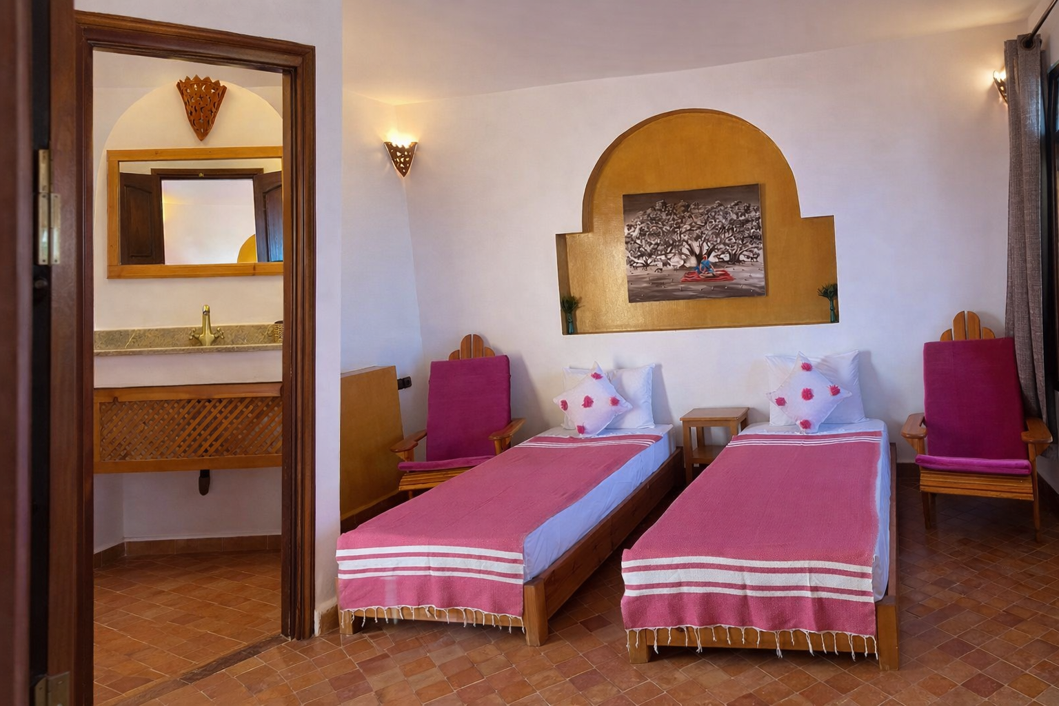 Cette chambre allie le design moderne au style traditionnel local.Les mobiliers réalisés par les artisans locaux rendent chaque chambre unique, grâce aux matériaux et au soin dans les détails qui caractérisent l'ameublement et la décoration. Chacune d'entre elles disposent d'un lit double ou de deux lits twin, d'une salle de bain avec WC, douche . Chaque chambre dispose également d’un accès Internet Wi-Fi gratuit, d’un coffre-fort.